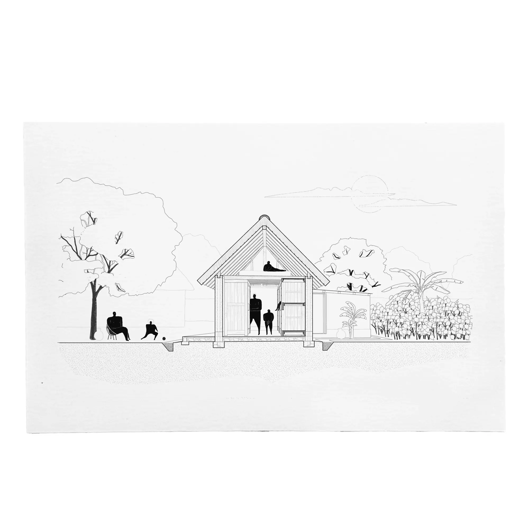 Situé dans un contexte rural, le Centre d’accueil pour enfants de Sowé s’organise de manière centripète. Le projet, divisé en quatre grands pôles, se structure autour d’un carré central dans lequel viennent se nicher le jardin potage et la cour, lien et lieu. Les trois autres grands pôles, la bibliothèque, la ferme et les maisons, se greffent autour de cet élément central, générant autant d’entrées et renforçant l’intériorité dans un contexte diffus.