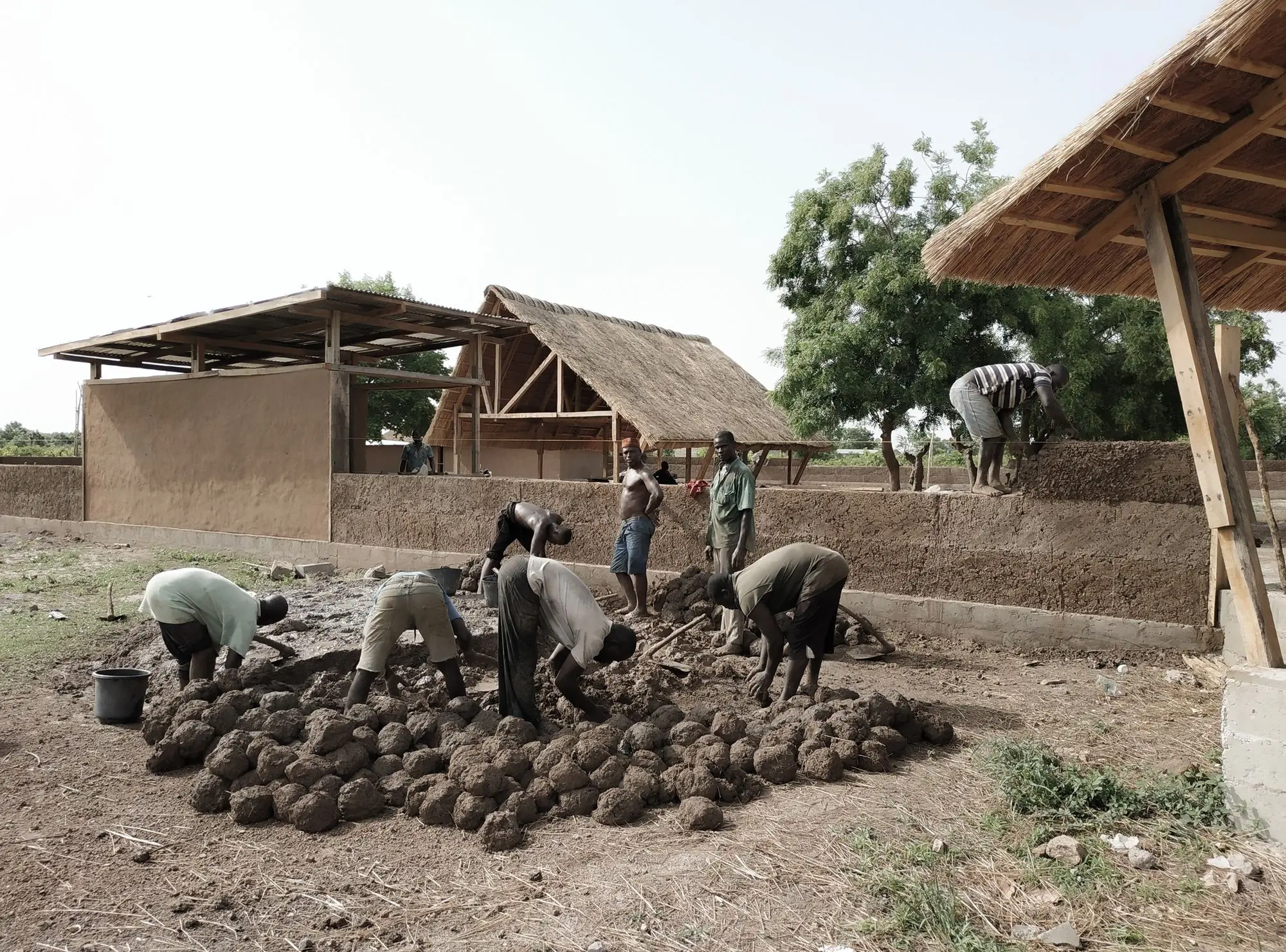 Construit de terre et de paille, le projet fait la part belle aux matériaux naturels et à leurs qualités intrisèques. Les matériaux proviennent d’un rayon de 30km aux alentours du village et les techniques utilisées, bauge pour les murs, chaume pour les toitures, renvoient aux cultures constructives locales.